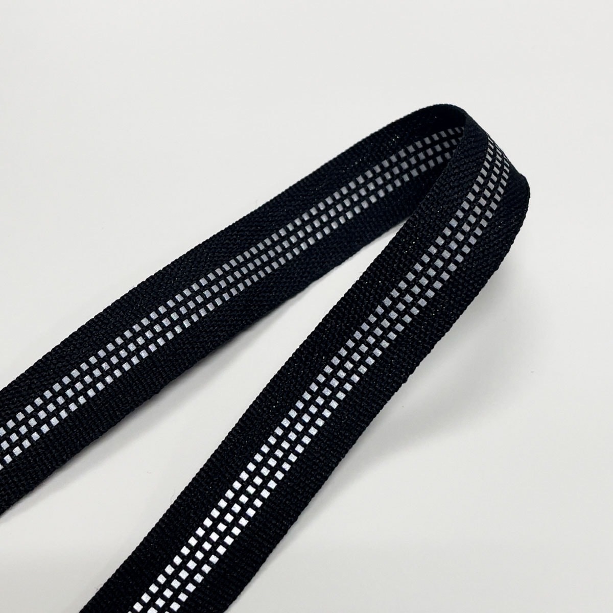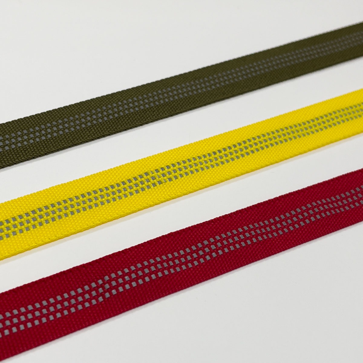 先染めポリエステルの糸て織った薄手のテープに再帰反射シートを織りこんだ色展開豊富なテープです。