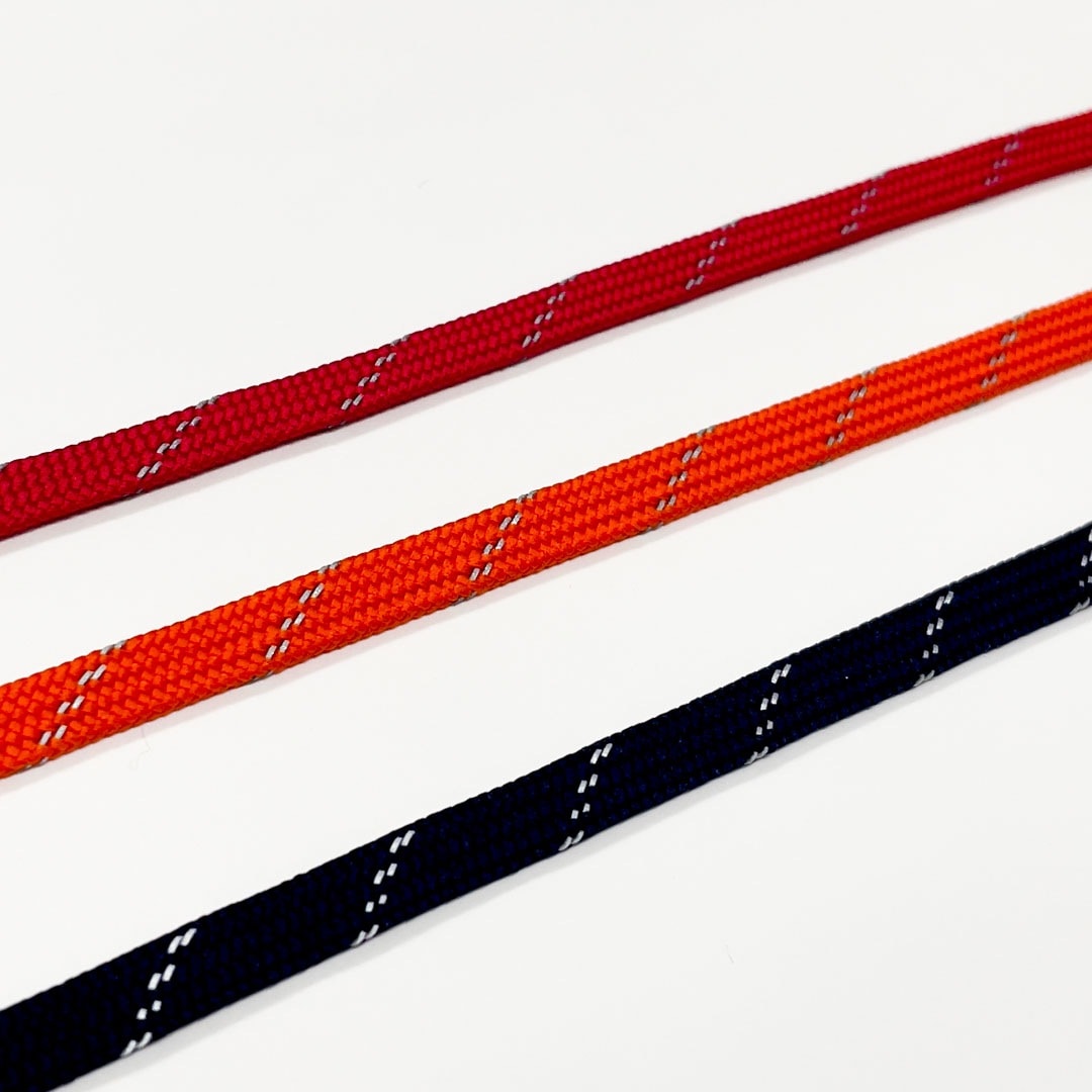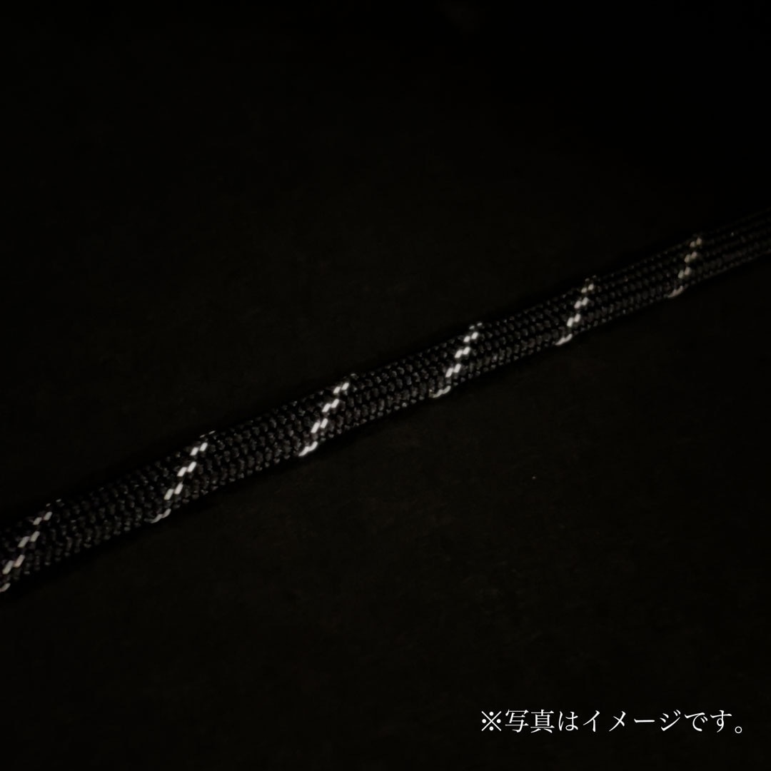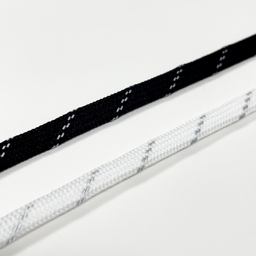 先染めポリエステルの平袋紐に反射シートのスリットを組み入れたコードです。