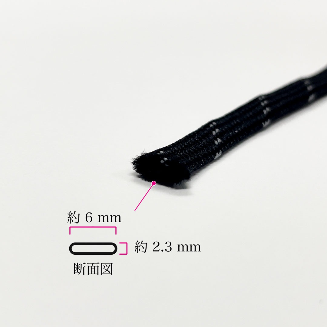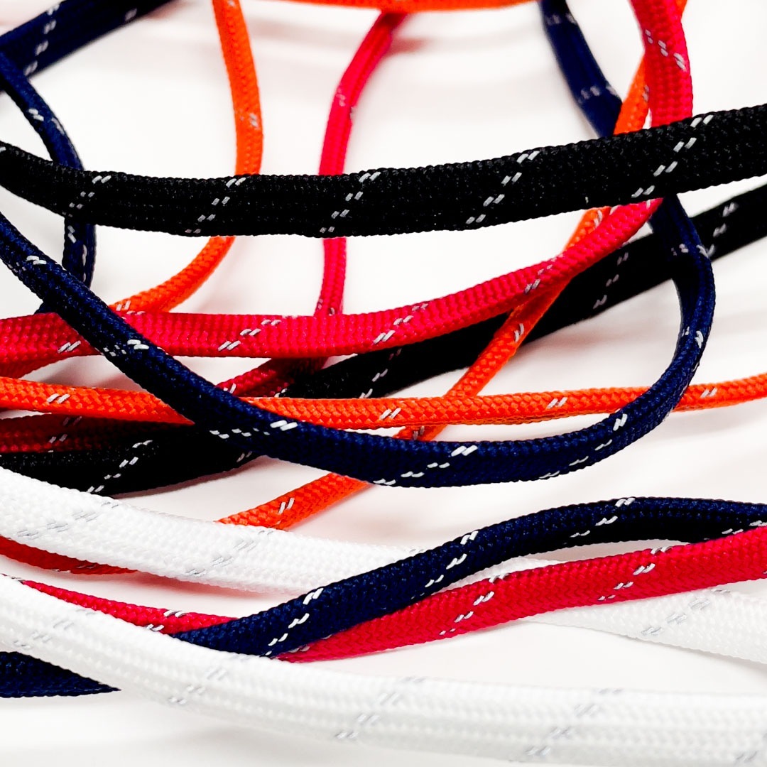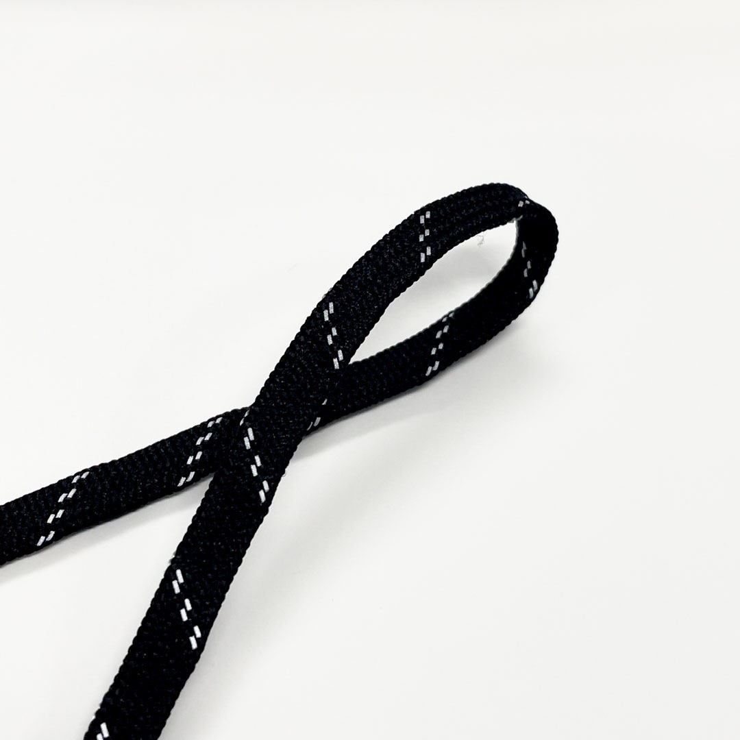 先染めポリエステルの平袋紐に反射シートのスリットを組み入れたコードです。