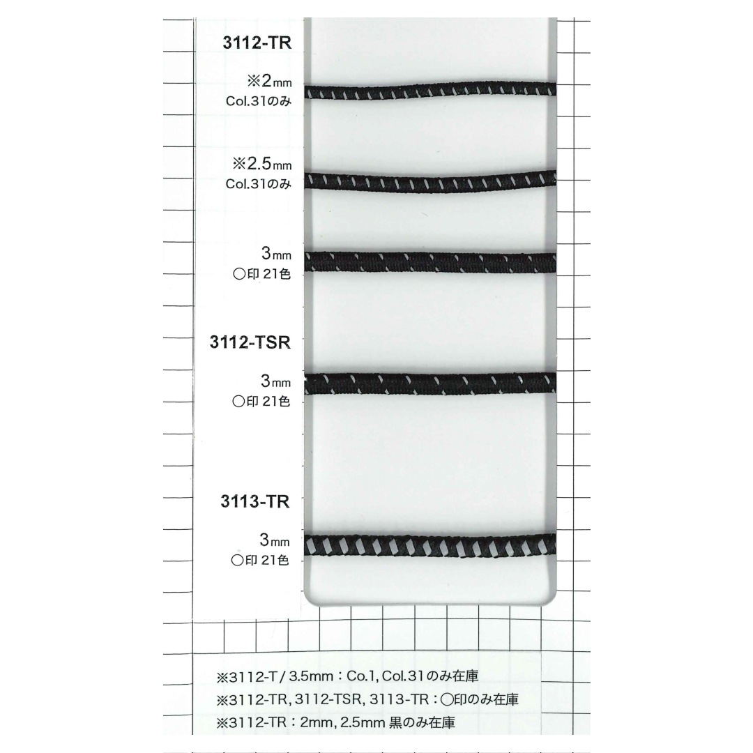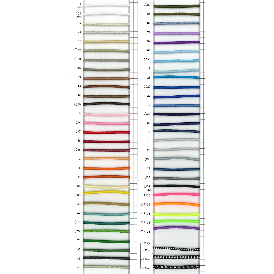 先染めポリエステルの表面の糸+反射スリッターx中芯天然ゴムのストレッチコードです。