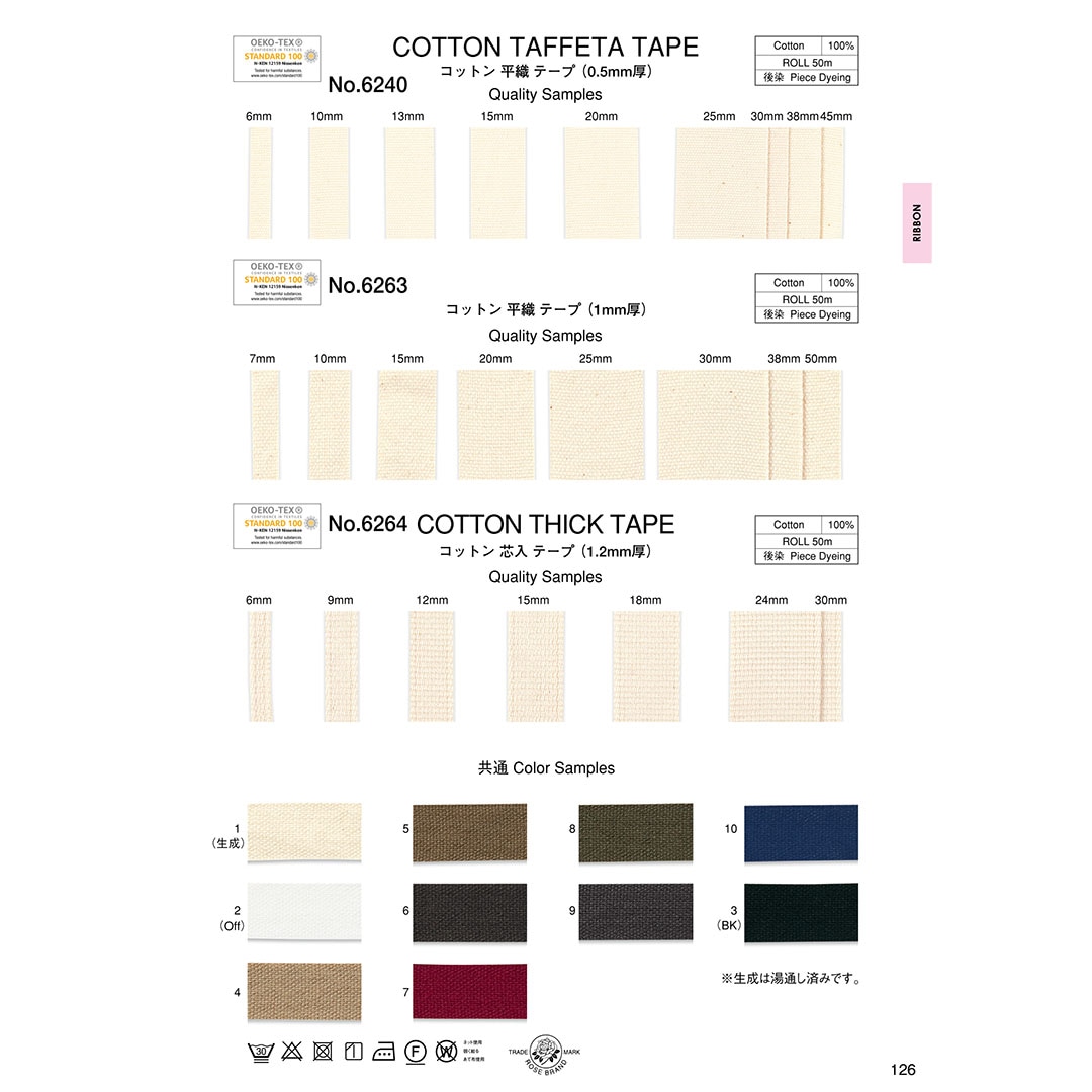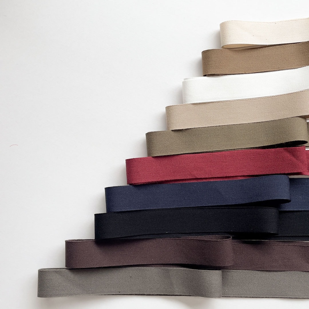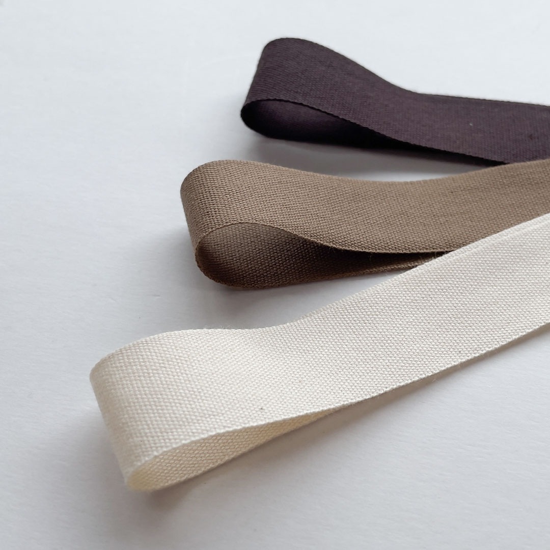 コットンの風合いをそのまま生かし細番手の糸で織った、薄手の平織りテープです。
