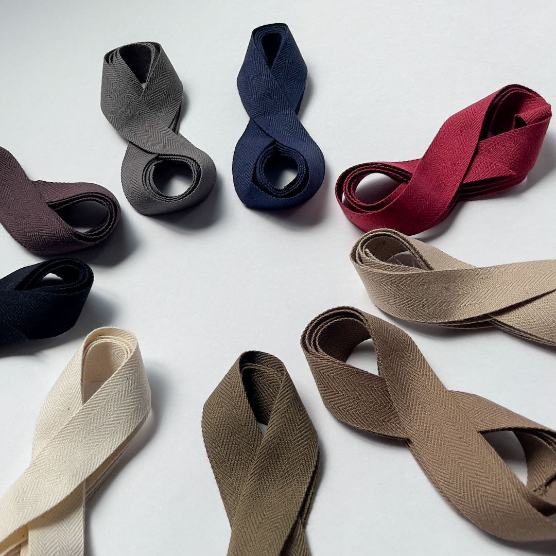 コットンの風合いをそのまま生かした糸で織った、薄手の杉綾テープです。