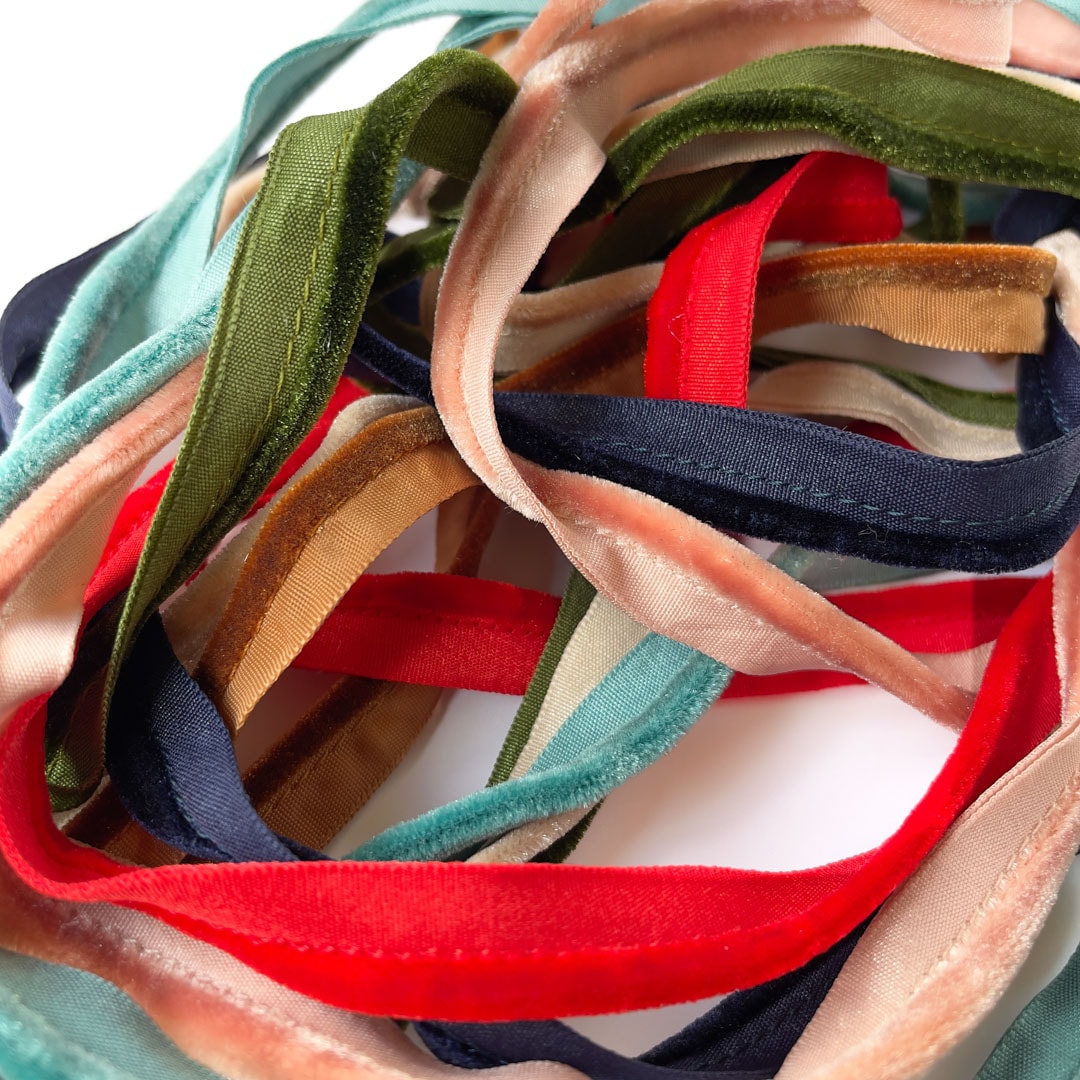 高度な縫製技術で頭の部分のベルベットx薄手の縫い代を実現させた、オリジナルのベルベットパイピングです。