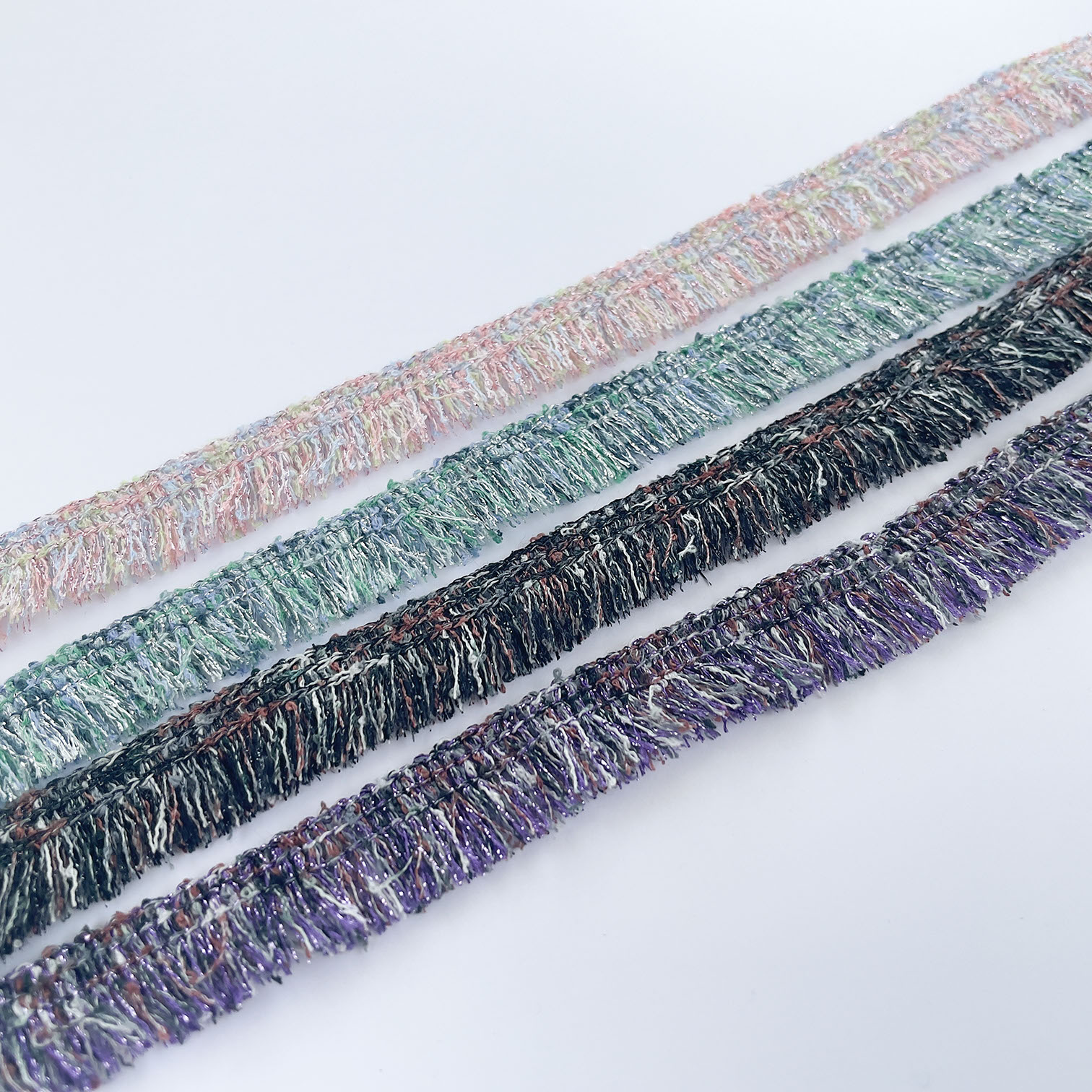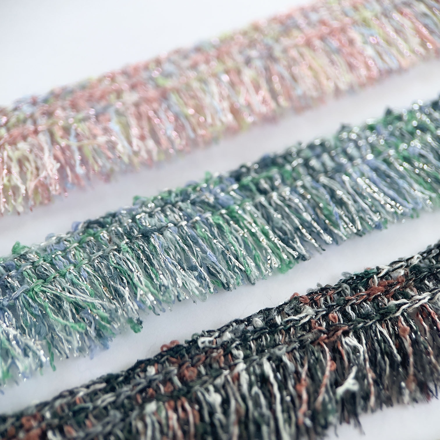 アクリル・ポリエステル・ナイロンという、異素材で色も異なる糸を曳き揃えてフリンジを作成しました。