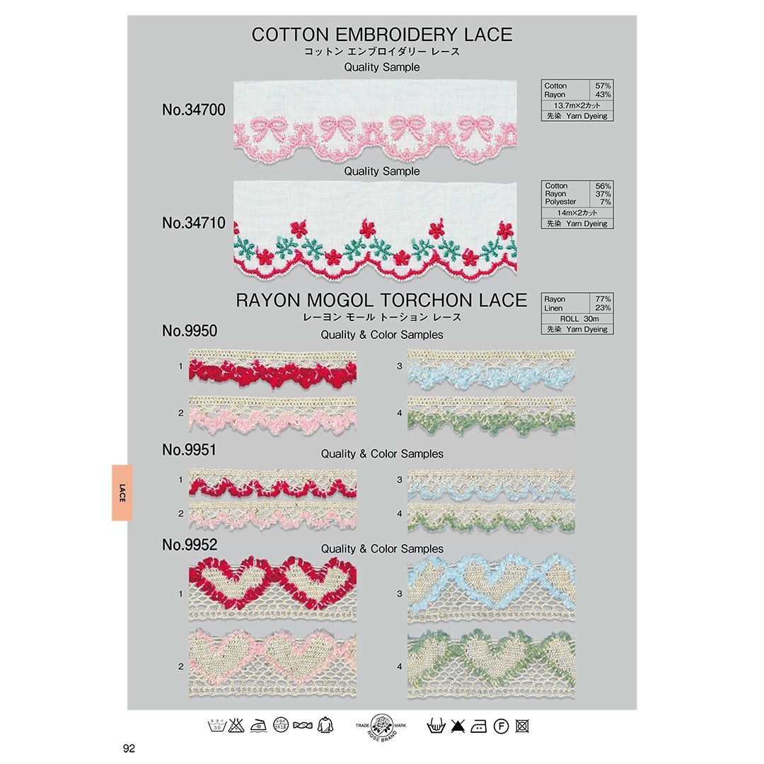 レーヨンリネン混のベースに、ハートの柄部分をレーヨンモールで立体感を出したモールトーションレースです。