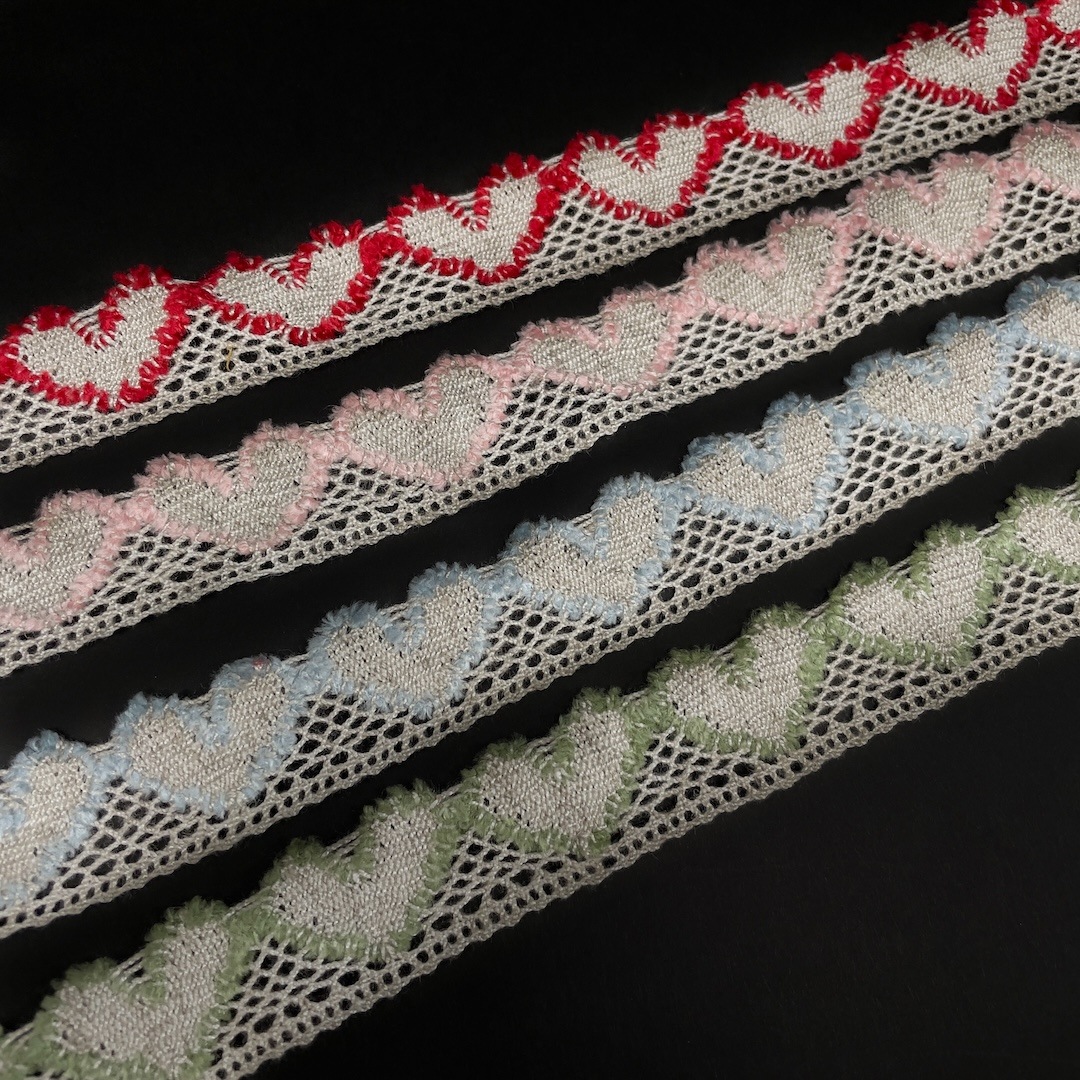 ナチュラルな色合いの中にモールの鮮やかな差し色のハートが相俟って、様々な用途に使えるレースです。