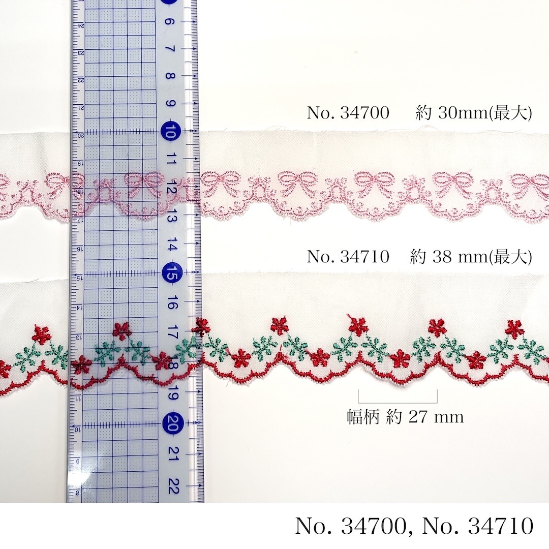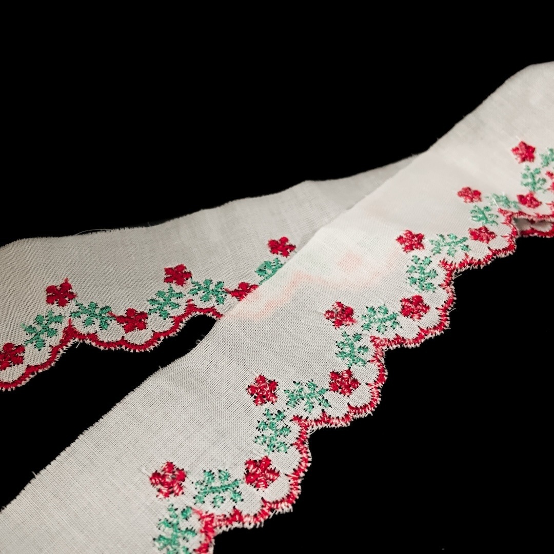 コットンベースに緑と赤のレーヨン糸で葉と花、スカラップ刺繍を施した、エンブロイダリーレースです。
