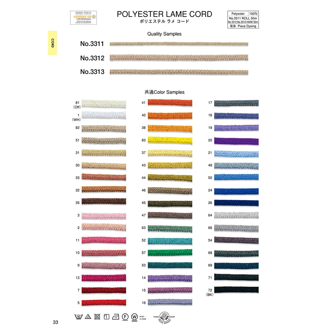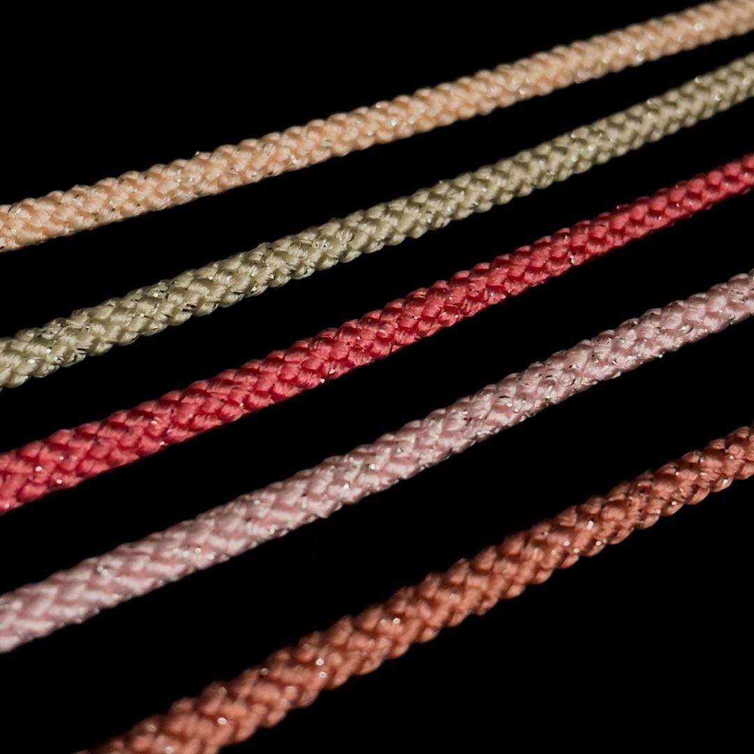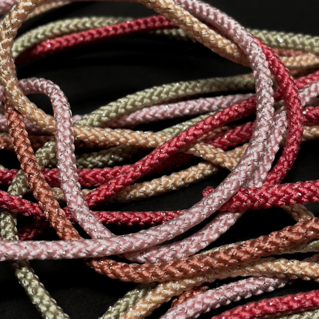 ポリエステルラメ糸を合糸したコード。