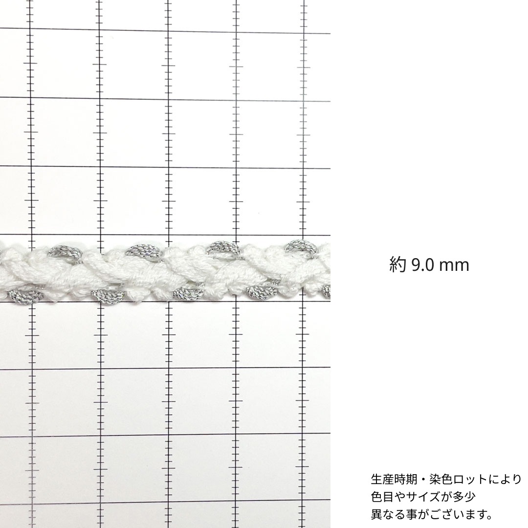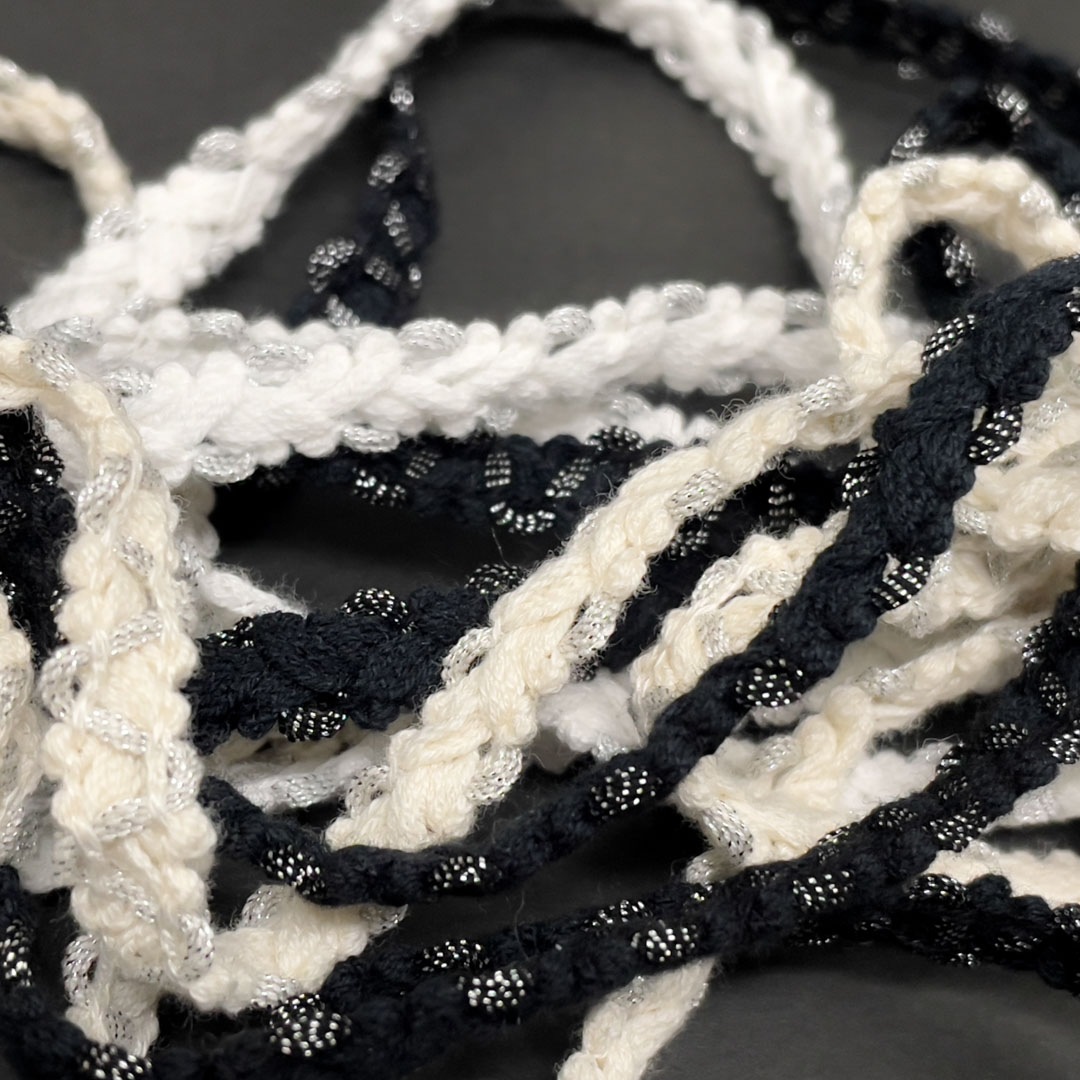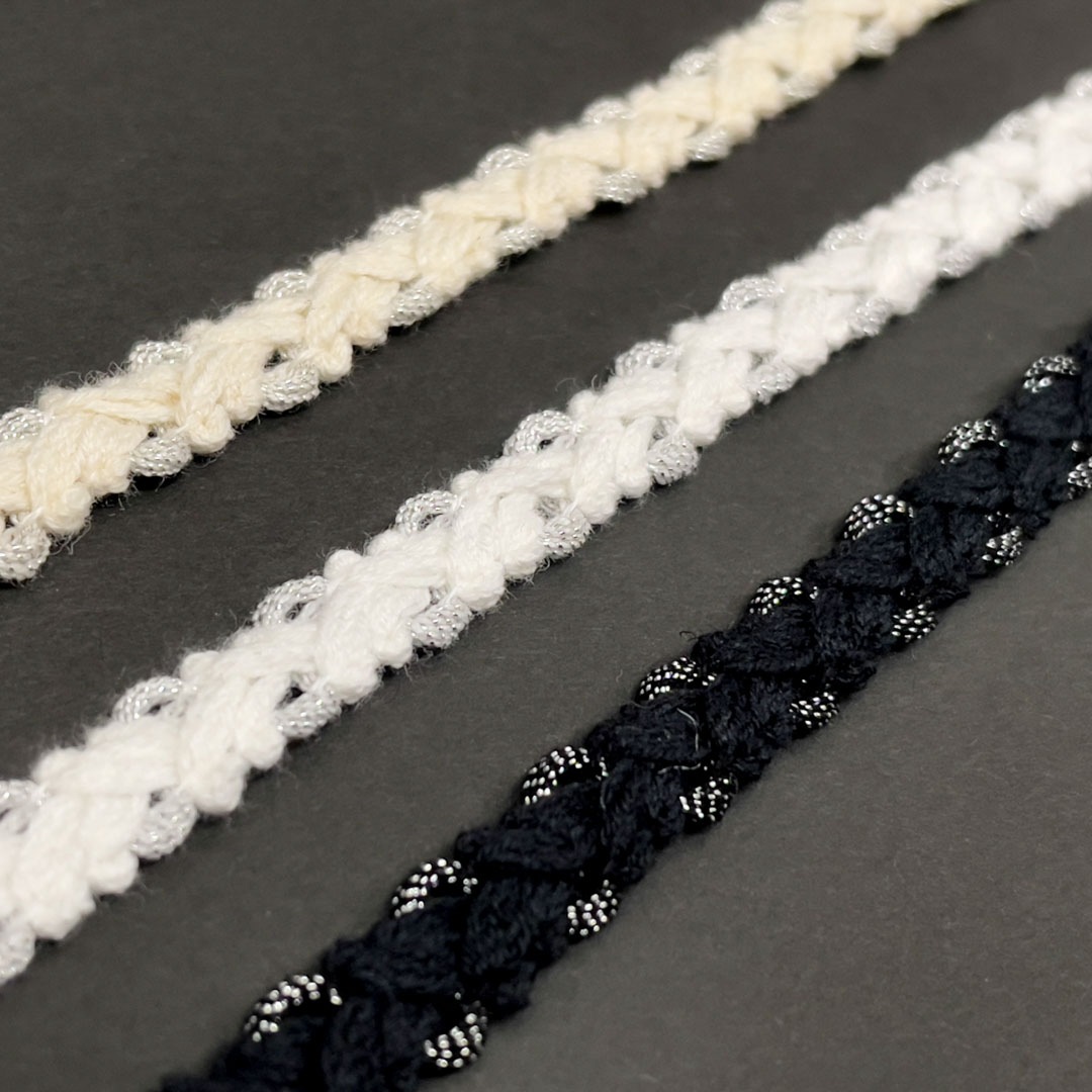 ナチュラル素材のコットンをベースにポリエステルラメ糸を編み込んだプチブレイドです。